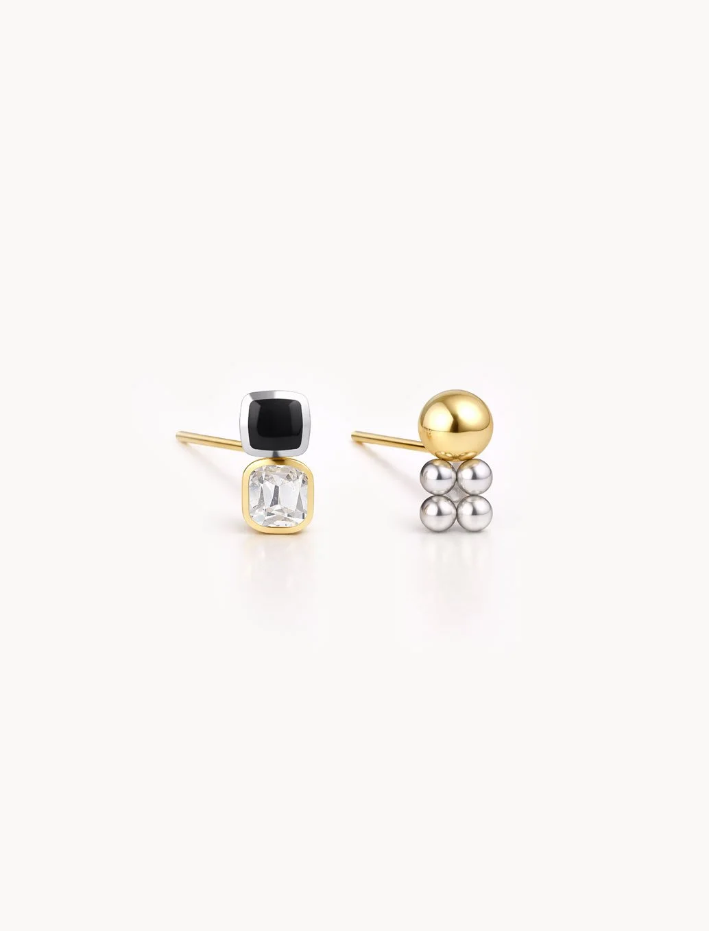 black onyx, moissanite diamond, recycled 18kt gold and sterling silver mismatched earring set. silicone inset ball backing.